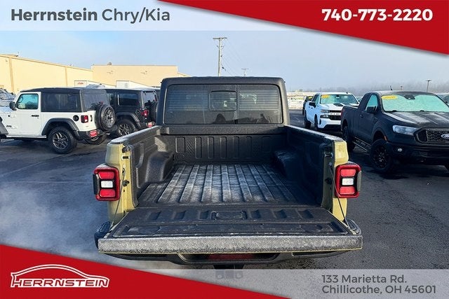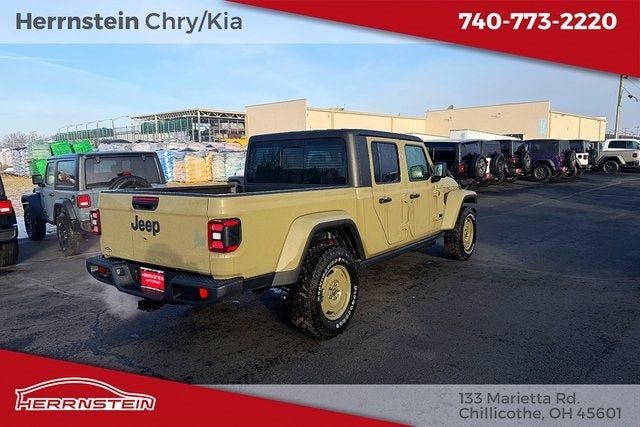 Herrnstein Auto Group is proud to offer this 2026 Jeep Gladiator in Green with Heritage Tan/Blk Clth Low. This Gladiator is very well equipped with 110 Mph Vehicle Max Speed Calibration, 12.3 Touchscreen Display, 3.73 Rear Axle Ratio, 4-Wheel Disc Brakes, 4G LTE Wi-Fi Hot Spot, 8 Speakers, ABS brakes, Air Conditioning, Alexa Built-in, AM/FM radio: SiriusXM with 360L, Apple CarPlay, Apple CarPlay/Android Auto, Brake assist, Compass, Connectivity - US/Canada, Delay-off headlights, Driver door bin, Driver vanity mirror, Dual front impact airbags, Dual front side impact airbags, Electronic Stability Control, For Details, Visit DriveUconnect.com, Front anti-roll bar, Front Bucket Seats, Front Center Armrest w/Storage, Front fog lights, Front reading lights, Google Android Auto, Illuminated entry, Integrated Center Stack Radio, Integrated roll-over protection, Low tire pressure warning, Normal Duty Suspension, Occupant sensing airbag, Outside temperature display, Overhead airbag, Panic alarm, ParkView Rear Back-Up Camera, Passenger door bin, Passenger vanity mirror, Power steering, Power windows, Radio data system, Radio: Uconnect 5 with 12.3 Display, Rear anti-roll bar, Rear reading lights, Remote keyless entry, SiriusXM Radio Service, SiriusXM with 360L, Speed control, Split folding rear seat, Steering wheel mounted audio controls, Tachometer, Telescoping steering wheel, Tilt steering wheel, Traction control, Trip computer, USB Host Flip, Variably intermittent wipers, Voltmeter, and Wheels: 17 x 7.5 Black Steel Styled. 17/22 City/Highway MPG