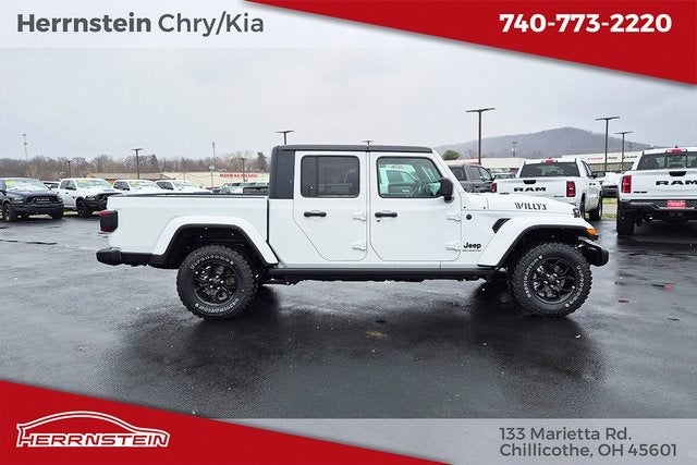 Herrnstein Auto Group is proud to offer this 2026 Jeep Gladiator Willys in Pw7 with Black Cloth. This Gladiator is very well equipped with Quick Order Package 24W Willys (4-Wheel Drive Decal, Advanced Brake Assist, Automatic Headlamps, Auxiliary Switches, Class IV Receiver Hitch, Cluster 7.0 TFT Color Display, Corning Gorilla Glass, Daytime Running Lamps LED Accents, Deep Tint Sunscreen Windows, E-Locker Rear Axle, Front Door Locks 2-Door Passive Entry, Front Heavy Duty Red Accent Shock Absorbers, Front LED Fog Lamps, Full Speed Forward Collision Warning Plus, Heavy-Duty Engine Cooling, LED Premium Reflector Headlamps, LED Taillamps, MOPAR All-Weather Slush Mats, Off-Road Plus Mode, Power Heated Mirrors, Premium Wrapped Steering Wheel, Protection Sill Rails, Rear Heavy Duty Red Accent Shock Absorbers, Security Alarm, Trailer Hitch Zoom, Wheels: 17 x 7.5 Painted Black, Willys Hood Decal, and Willys Suspension), 3.73 Rear Axle Ratio, 4-Wheel Disc Brakes, 8 Speakers, ABS brakes, Air Conditioning, AM/FM radio: SiriusXM with 360L, Apple CarPlay/Android Auto, Black 3-Piece Hard Top, Brake assist, Cloth Low-Back Bucket Seats, Compass, Delay-off headlights, Driver door bin, Driver vanity mirror, Dual front impact airbags, Dual front side impact airbags, Electronic Stability Control, Freedom Panel Storage Bag, Front anti-roll bar, Front Bucket Seats, Front Center Armrest w/Storage, Front fog lights, Front License Plate Bracket, Front reading lights, Illuminated entry, Integrated roll-over protection, Low tire pressure warning, Manufacturer's Statement of Origin, MOPAR Plastic Door Sill Guards, Normal Duty Suspension, Occupant sensing airbag, Outside temperature display, Overhead airbag, Panic alarm, ParkView Rear Back-Up Camera, Passenger door bin, Passenger vanity mirror, Power steering, Power windows, Radio data system, Rear anti-roll bar, Rear reading lights, Rear Sliding Window, Rear Window Defroster, Remote keyless entry, Speed control, Split folding rear seat, Steering wheel mounted audio controls, Tachometer, Telescoping steering wheel, Tilt steering wheel, Traction control, Trip computer, Variably intermittent wipers, Voltmeter, and Wheels: 17 x 7.5 Black Steel Styled. 17/22 City/Highway MPG