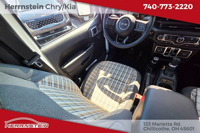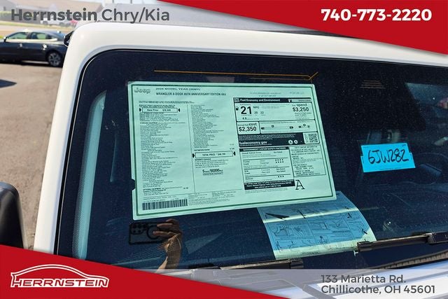 Herrnstein Auto Group is proud to offer this 2026 Jeep Wrangler in Bright White Clearcoat with Black Cloth. This Wrangler is very well equipped with Quick Order Package 22F 85th Anniversary Edition (2-Door Passive Entry, Front Door Locks, 85th Anniversary Group, 85th Cupholder Plaque, 85th Fender Decal, 85th Shifter Medallion, 85th Tailgate Decal, 85th Wrangler Hood Decal, Adaptive Cruise Control with Stop, Advanced Brake Assist, Air Conditioning with Auto Temp Control, Air Filtering, Alpine Premium Audio System, Anti-Lock 4-Wheel Disc Brakes, Automatic Headlamps, Berber Cargo Mats, Berber Floor Mats, Body Color Fenders Flares, Bronze Tow Hooks, Central ADAS Decision Module (CADM), Cloth Seat with Plaid Insert and Tag, Cluster 7.0 TFT Color Display, Corning Gorilla Glass, Daytime Running Lamps LED Accents, Deep Tint Sunscreen Windows, Emergency/Assistance Call, Front LED Fog Lamps, Full Speed Forward Collision Warning Plus, Gray/Bronze Trail Rated Badge, Heated Front Seats, Heated Steering Wheel, LED Premium Reflector Headlamps, Mayan Gold Interior Accents, Plaid Wrap Instrument Panel Mid-Bolster, Power Heated Mirrors, Premium Wrapped Steering Wheel, Security Alarm, Sun Visors with Illuminated Vanity Mirrors, Universal Garage Door Opener, and Wheels: 17 x 7.5 Steel Oxide), 12.3 Touchscreen Display, 3.45 Overall Top Gear Ratio, 4-Wheel Disc Brakes, 4G LTE Wi-Fi Hot Spot, 8 Speakers, ABS brakes, Air Conditioning, AM/FM radio: SiriusXM with 360L, Apple CarPlay, Apple CarPlay/Android Auto, Aux Battery, Brake assist, Compass, Connectivity - US/Canada, Delay-off headlights, Driver door bin, Driver vanity mirror, Dual front impact airbags, Dual front side impact airbags, Electronic Stability Control, For More Info, Call 800-643-2112, Front anti-roll bar, Front Bucket Seats, Front Center Armrest w/Storage, Front fog lights, Front reading lights, Google Android Auto, Illuminated entry, Integrated Center Stack Radio, Integrated roll-over protection, Low tire pressure warning, Manufacture Statement of Origin, Non-Lock Fuel Cap Without Discriminator, Normal Duty Suspension, Occupant sensing airbag, Outside temperature display, Overhead airbag, Panic alarm, ParkView Rear Back-Up Camera, Passenger door bin, Passenger vanity mirror, Power steering, Power windows, Radio data system, Radio: Uconnect 5 with 12.3 Display, Rear anti-roll bar, Rear reading lights, Remote keyless entry, SiriusXM Radio Service, SiriusXM with 360L, Speed control, Split folding rear seat, Steering wheel mounted audio controls, Stop-Start Dual Battery System, Tachometer, Telescoping steering wheel, Tilt steering wheel, Traction control, Trip computer, Variably intermittent wipers, and Wheels: 17 x 7.5 Black Steel Styled. 20/22 City/Highway MPG