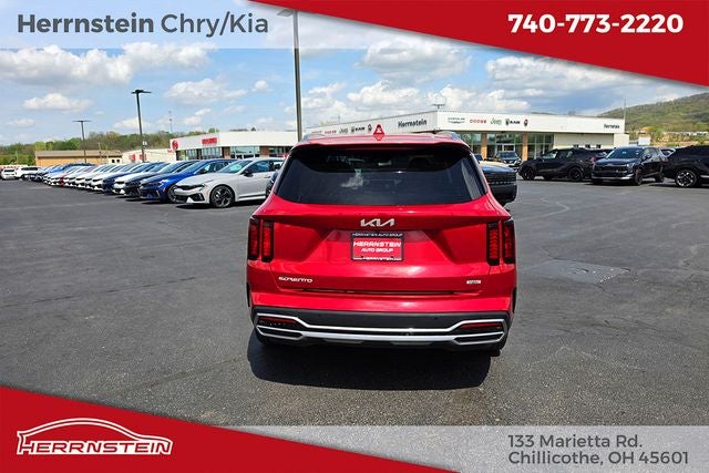 Herrnstein Auto Group is proud to offer this 2023 Kia Sorento Hybrid EX in Runway Red with Black Artificial Leather. This Sorento Hybrid is very well equipped with 1.6L I4 DGI Hybrid Turbocharged DOHC 16V LEV3-ULEV70, 3rd row seats: split-bench, 4-Wheel Disc Brakes, 6 Speakers, ABS brakes, Air Conditioning, Alloy wheels, AM/FM radio: SiriusXM, Apple CarPlay & Android Auto, Auto Dimming Mirror w/HomeLink (PNP), Auto High-beam Headlights, Automatic temperature control, Axle Ratio: 3.510, Brake assist, Bumper Applique Texture, Bumpers: body-color, Carpet Floor Mats, Delay-off headlights, Driver door bin, Driver vanity mirror, Dual front impact airbags, Dual front side impact airbags, Electronic Stability Control, Emergency communication system, Exterior Parking Camera Rear, Folding Cargo Tray, Four wheel independent suspension, Front anti-roll bar, Front Bucket Seats, Front Center Armrest, Front dual zone A/C, Front fog lights, Front reading lights, Fully automatic headlights, Heated door mirrors, Heated Front Bucket Seats, Heated front seats, Illuminated entry, Illuminated Scuff Plates, Interior Lighting Kit, Knee airbag, Leather steering wheel, Low tire pressure warning, Navigation System, Occupant sensing airbag, Outside temperature display, Overhead airbag, Overhead console, Panic alarm, Passenger door bin, Passenger vanity mirror, Power door mirrors, Power driver seat, Power Liftgate, Power passenger seat, Power steering, Power windows, Radio data system, Radio: AM/FM/HD Radio/SiriusXM Audio System, Rear air conditioning, Rear anti-roll bar, Rear reading lights, Rear window defroster, Rear window wiper, Remote keyless entry, Roof rack: rails only, Security system, Smart Key w/ Push Button and Remote Start, Speed control, Speed-sensing steering, Split folding rear seat, Spoiler, Steering wheel mounted audio controls, SynTex Artificial Leather Seat Trim, Tachometer, Telescoping steering wheel, Tilt steering wheel, Traction control, Trip computer, Turn signal indicator mirrors, Variably intermittent wipers, and Wheels: 19 Machine-Finished Alloy. 36/33 City/Highway MPG